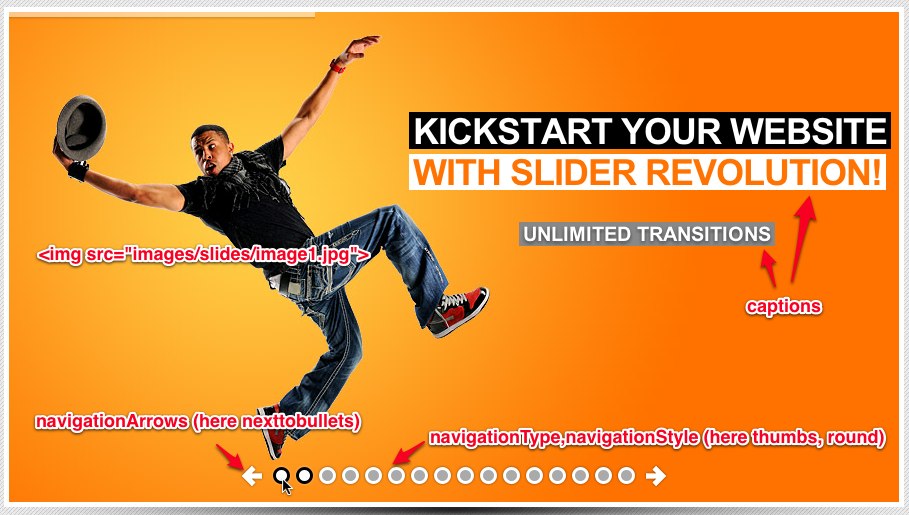 <ul> <!-- THE BOXSLIDE EFFECT EXAMPLES WITH LINK ON THE MAIN SLIDE EXAMPLE --> <li data-transition="flyin" data-slotamount="5" data-thumb="images/thumbs/regular_thumb1.jpg"> <img src="images/slides/newslide1.jpg"> <div class="caption randomrotate fadeout medium_grey" data-x="40" data-y="20" data-speed="900" data-start="1900" data-easing="easeOutBack" data-linktoslide="4">jump slide 4</div> <div class="caption randomrotate fadeout medium_grey" data-x="40" data-y="50" data-speed="900" data-start="2100" data-easing="easeOutBack" data-linktoslide="prev">prev slide</div> <div class="caption randomrotate fadeout medium_grey" data-x="40" data-y="80" data-speed="900" data-start="2100" data-easing="easeOutBack" data-linktoslide="next">next slide</div> <div class="caption lfr randomrotateout big_white" data-x="400" data-y="80" data-speed="900" data-start="1700" data-easing="easeOutBack" data-end="3300" data-endspeed="1000" data-endeasing="easeInOutBack" data-linktoslide="4">Kickstart Your Website</div> <div class="caption lfb big_orange" data-x="400" data-y="80" data-speed="1500" data-start="3000" data-easing="easeOutBack"> Some Caption Here</div> </li> ... </ul>